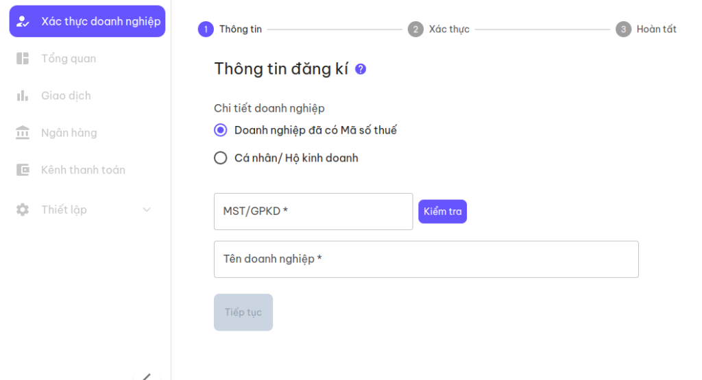 - Bước 3: Xác thực doanh nghiệp hoặc cá nhân với thông tin ngân hàng MB Bank